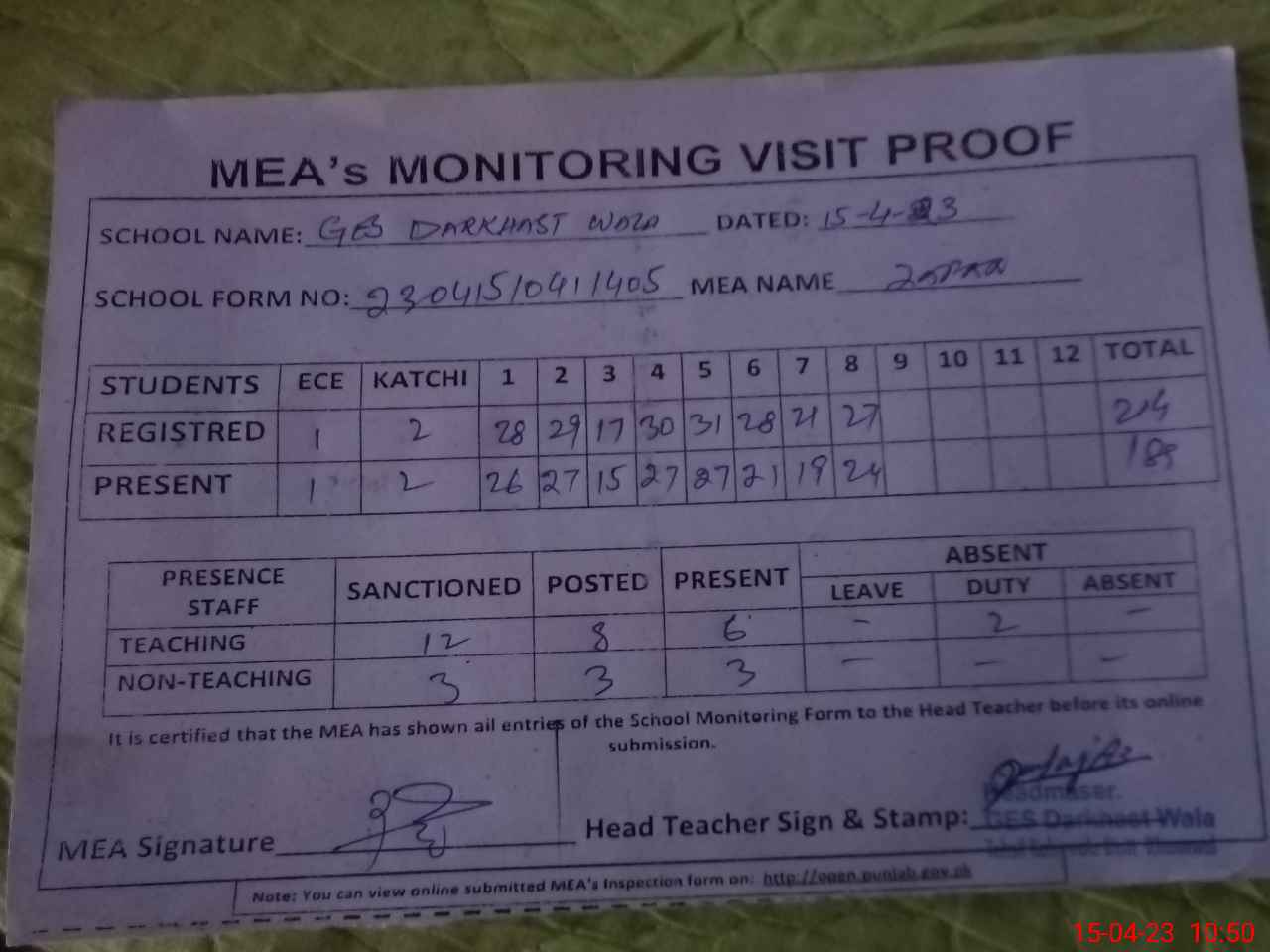 | Attendance Register | Head Teacher | MEA with School | Visit Proof |