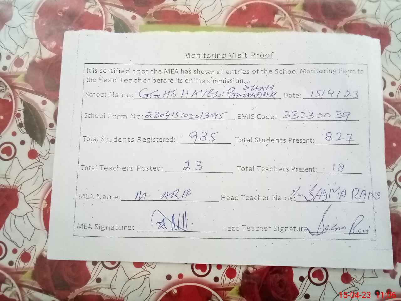 | Attendance Register | Head Teacher | MEA with School | Visit Proof |