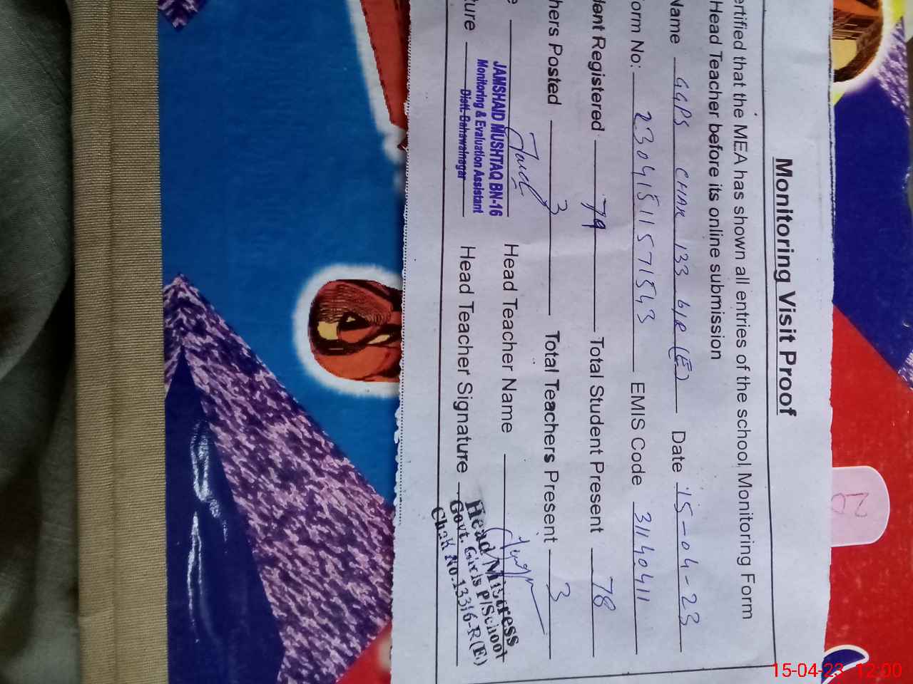 | Attendance Register | Head Teacher | MEA with School | Visit Proof |