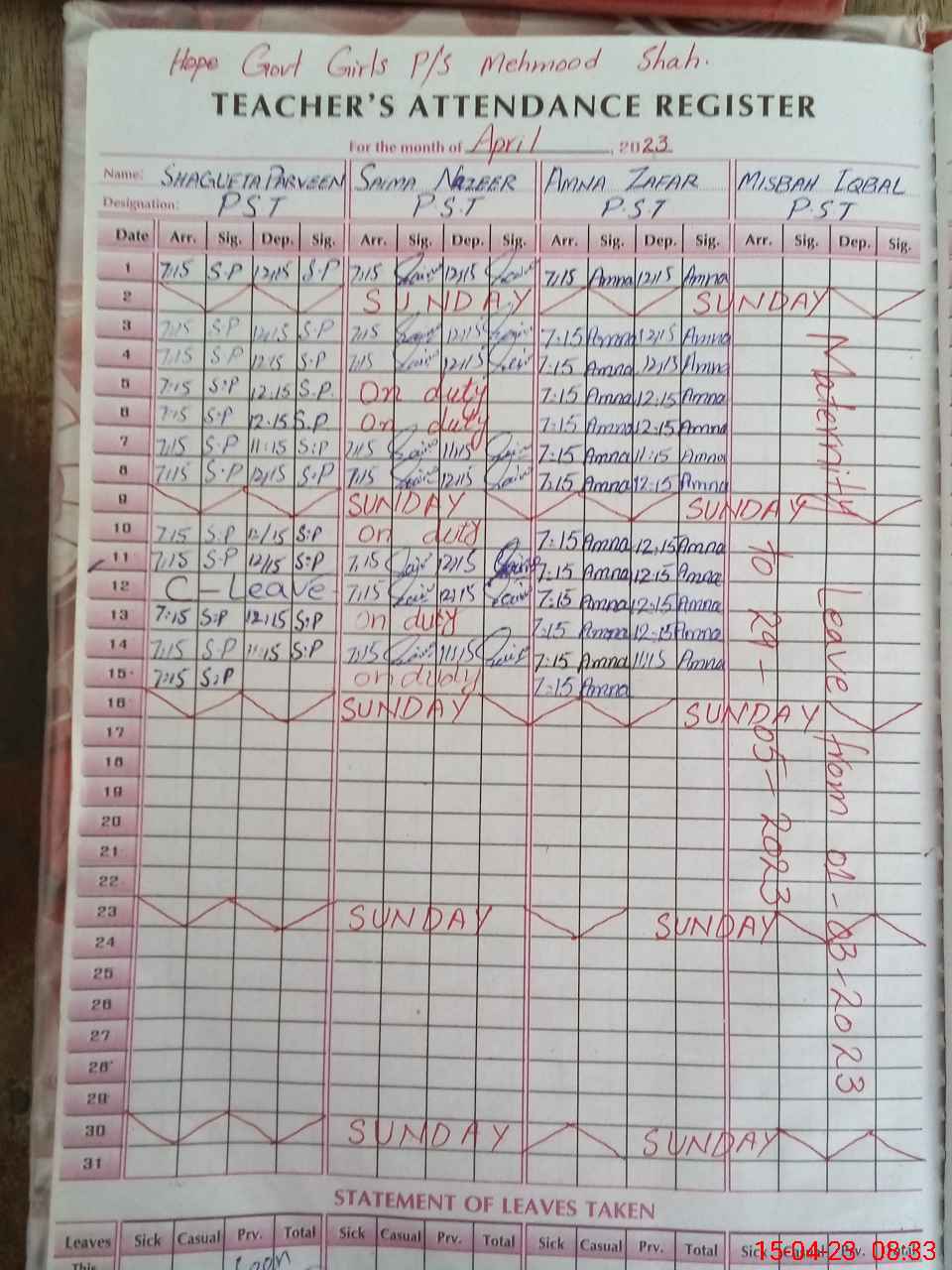 | Leave | Duty | Absent | Maternity | Medical | Ex- Pak |