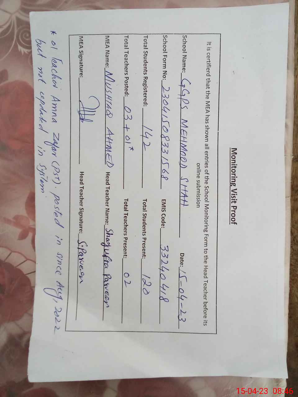| Attendance Register | Head Teacher | MEA with School | Visit Proof |