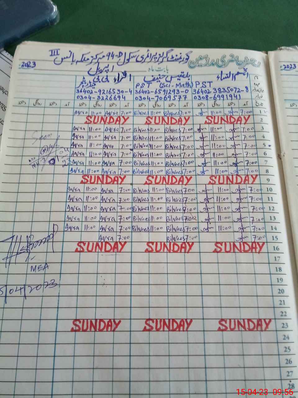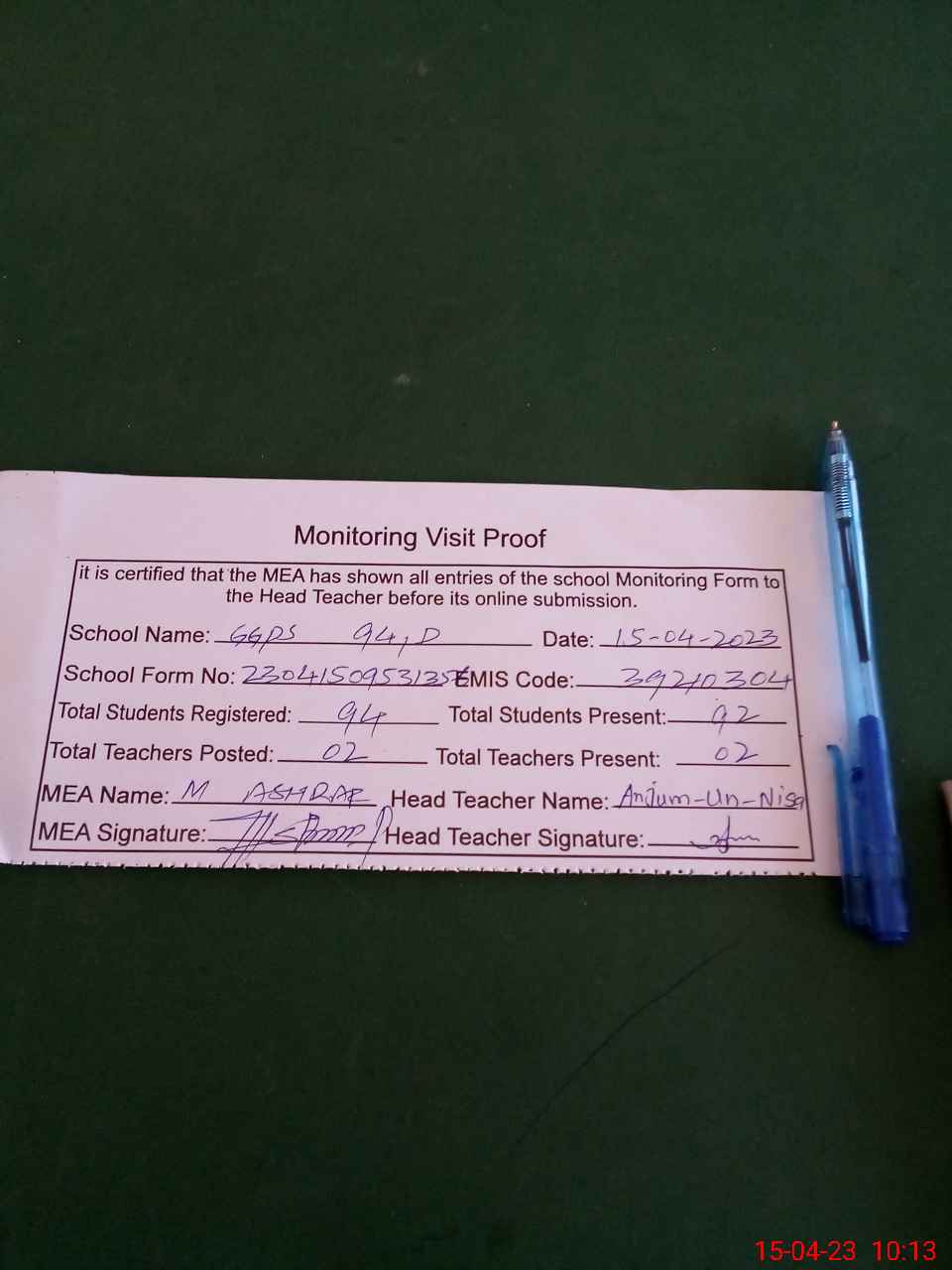 | Attendance Register | Head Teacher | MEA with School | Visit Proof |