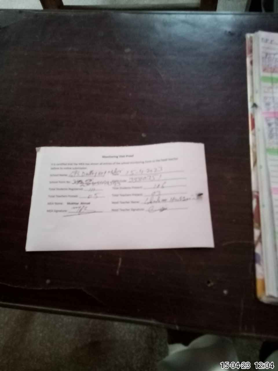 | Attendance Register | Head Teacher | MEA with School | Visit Proof |