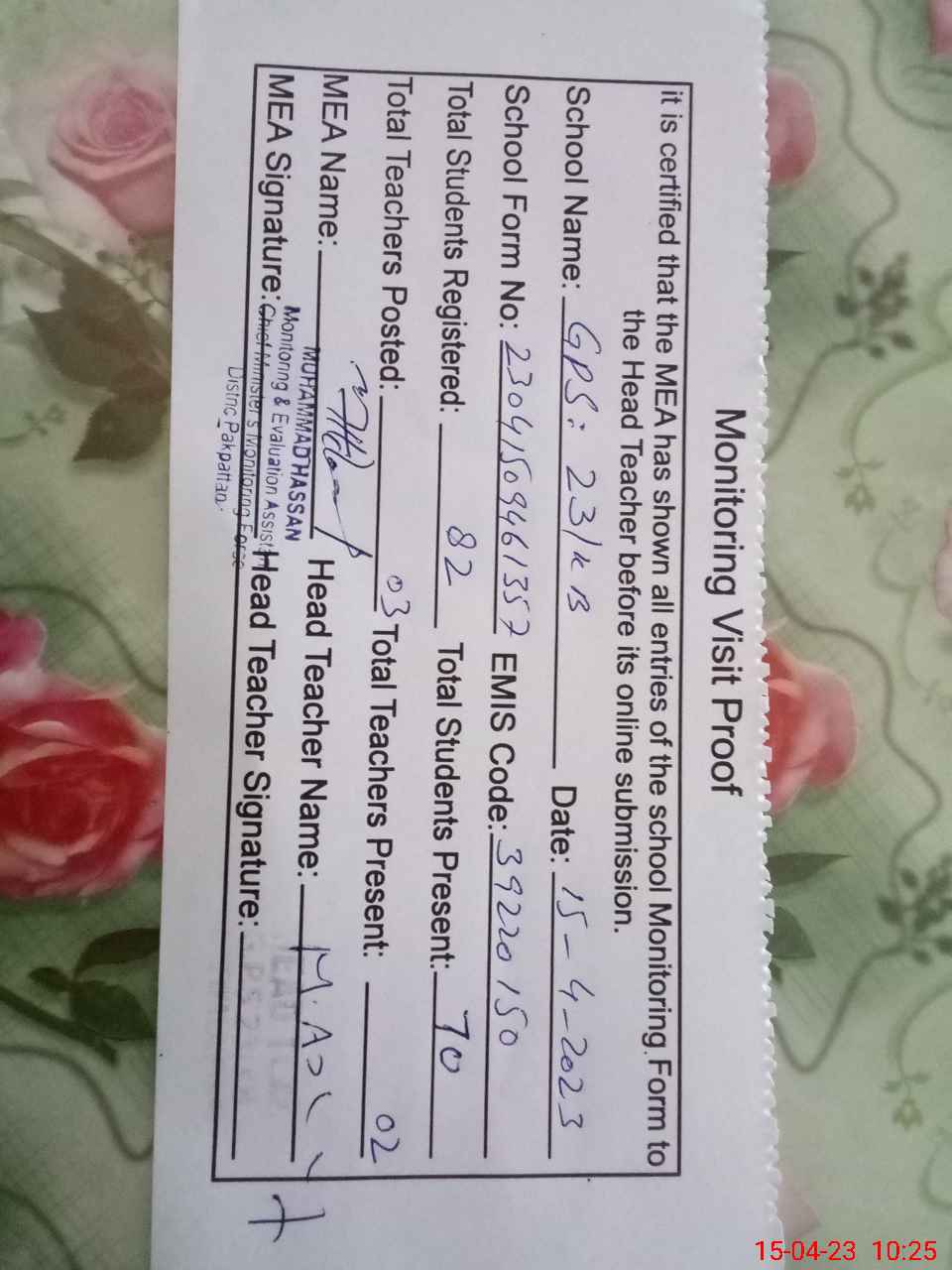 | Attendance Register | Head Teacher | MEA with School | Visit Proof |