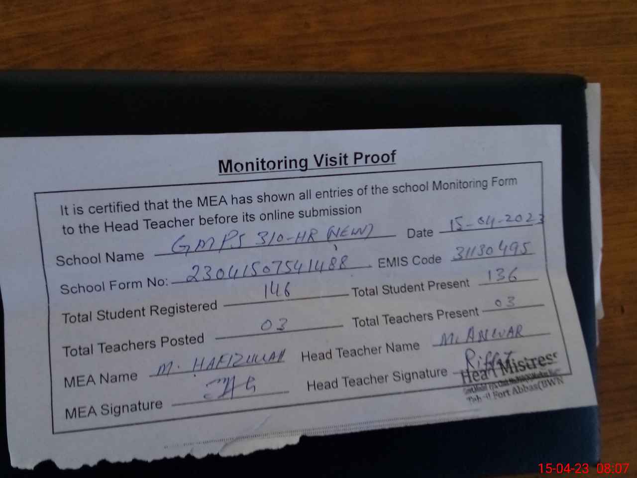 | Attendance Register | Head Teacher | MEA with School | Visit Proof |