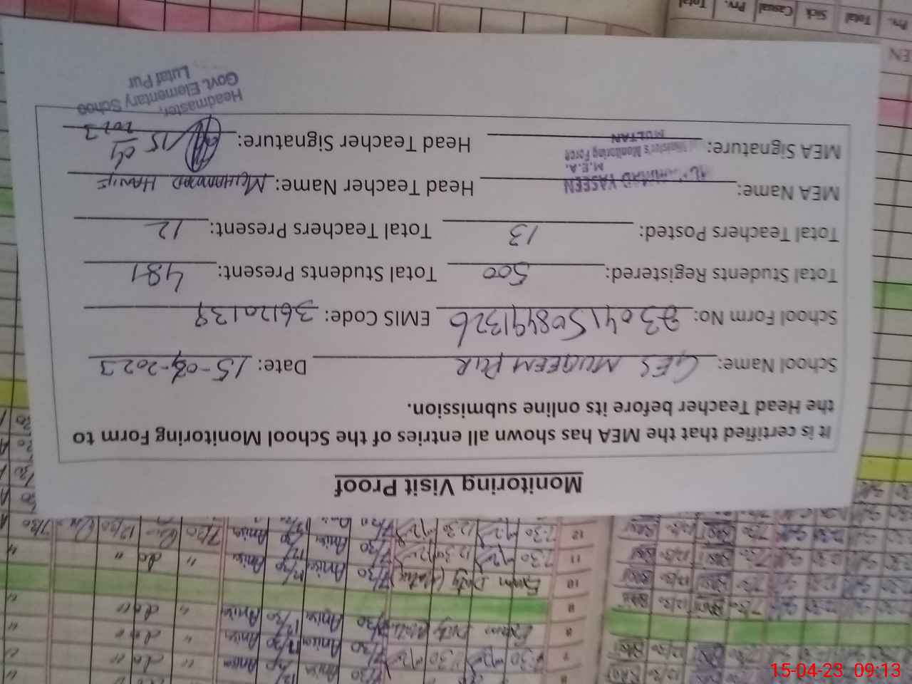 | Attendance Register | Head Teacher | MEA with School | Visit Proof |