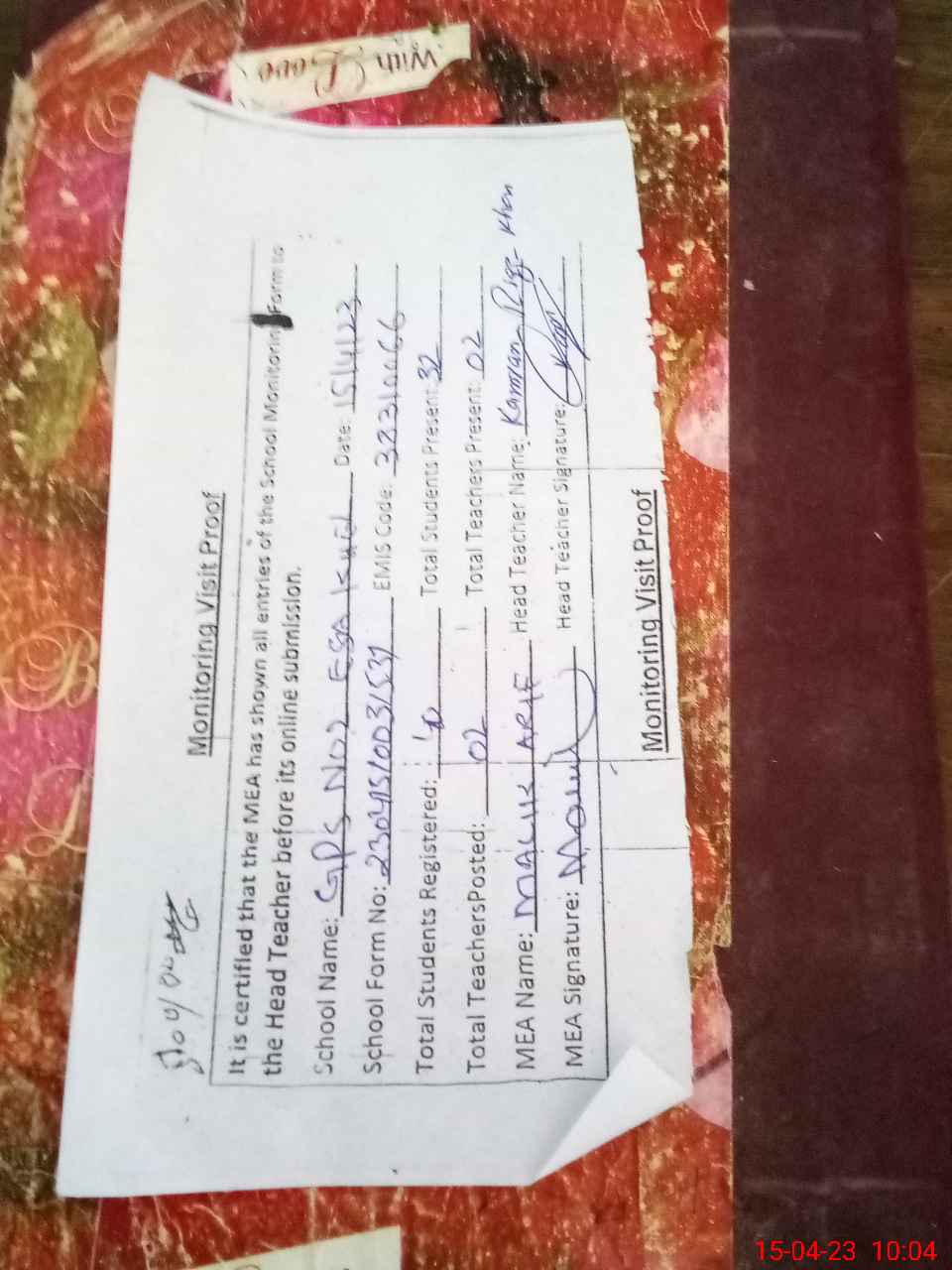 | Attendance Register | Head Teacher | MEA with School | Visit Proof |