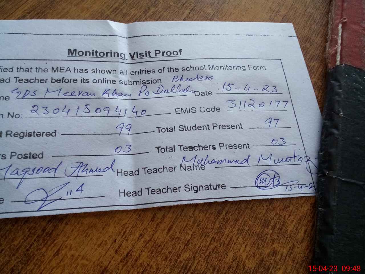 | Attendance Register | Head Teacher | MEA with School | Visit Proof |