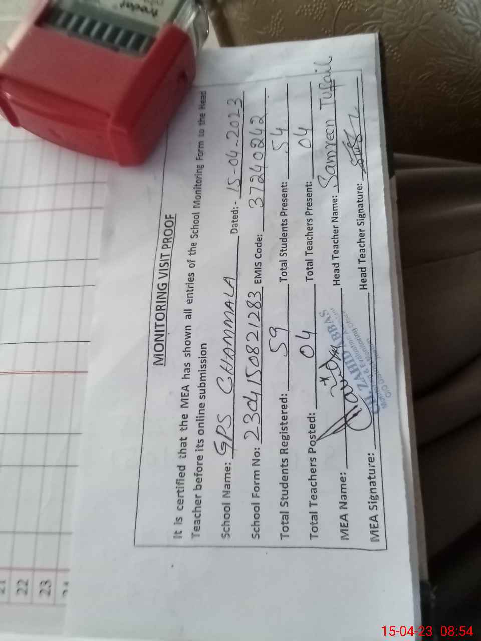 | Attendance Register | Head Teacher | MEA with School | Visit Proof |