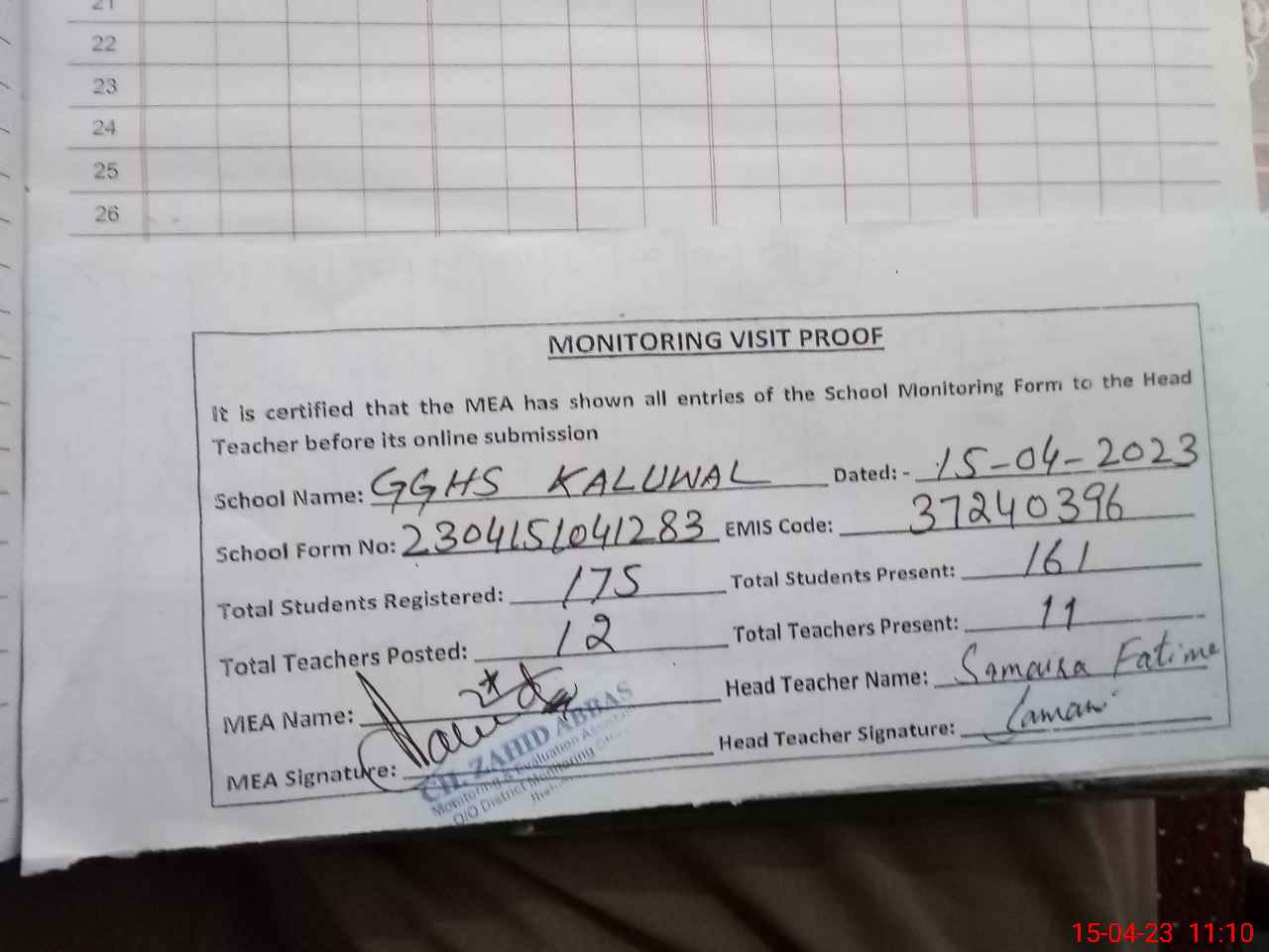 | Monitoring Date: 15-04-2023 | Start Time: 15-04-2023 10:40 AM | End Time: 15-04-2023 11:11 AM | Name of MEA: Za**** Ab**** | |