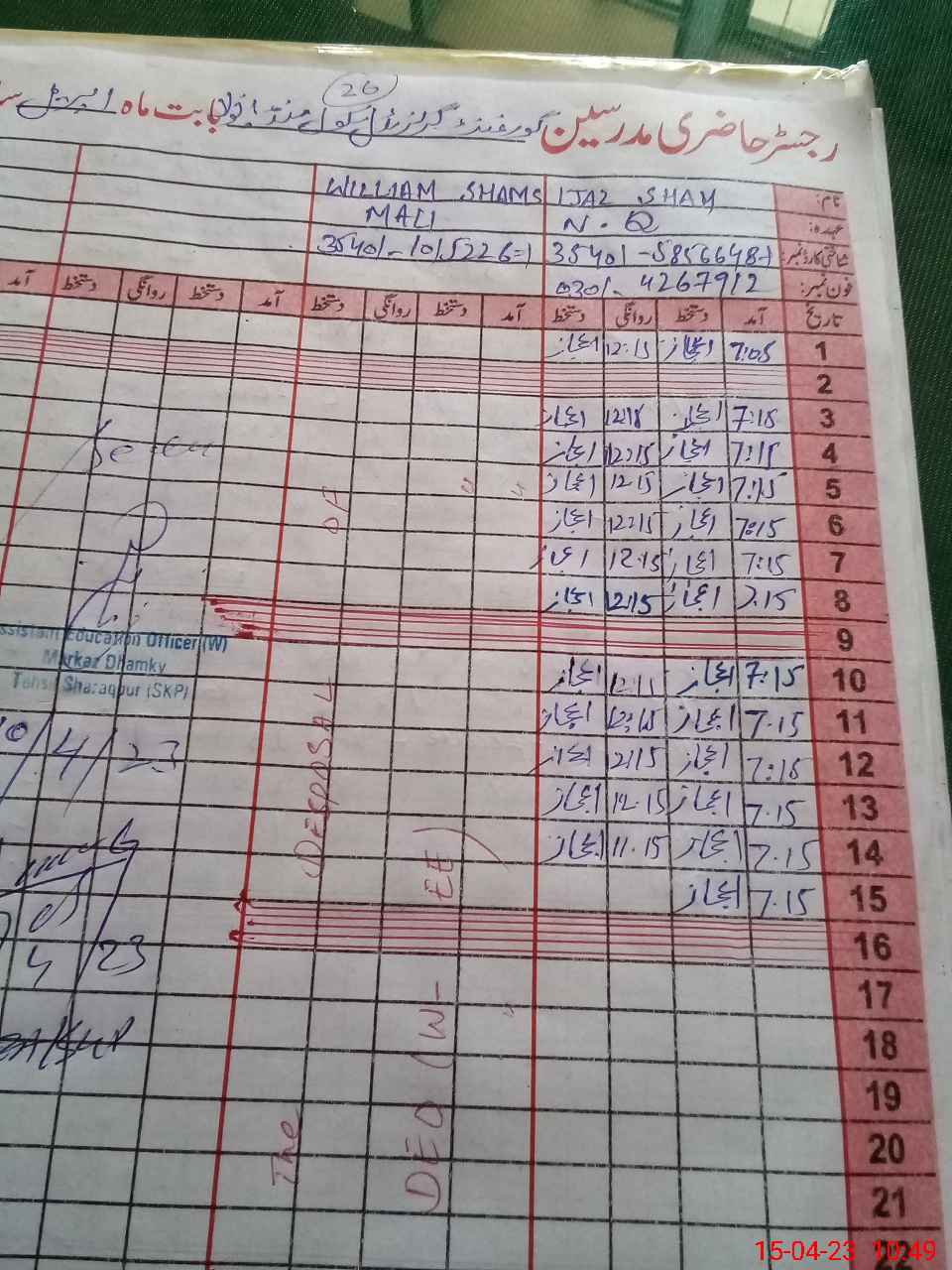 | Name: Na**** Ir**** Designation: (School Headmaster's/Headmistress's) SST Science Phone/Cell Number: 03**** |