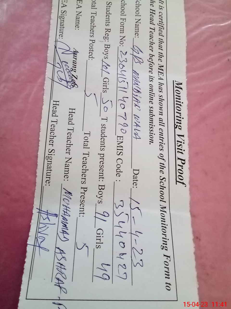 | Attendance Register | Head Teacher | MEA with School | Visit Proof |