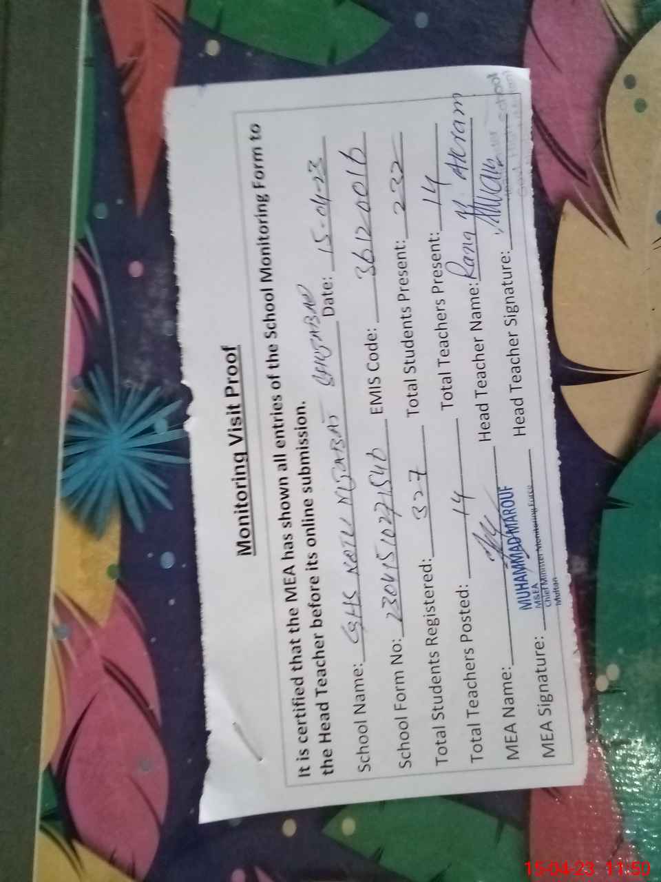 | Attendance Register | Head Teacher | MEA with School | Visit Proof |