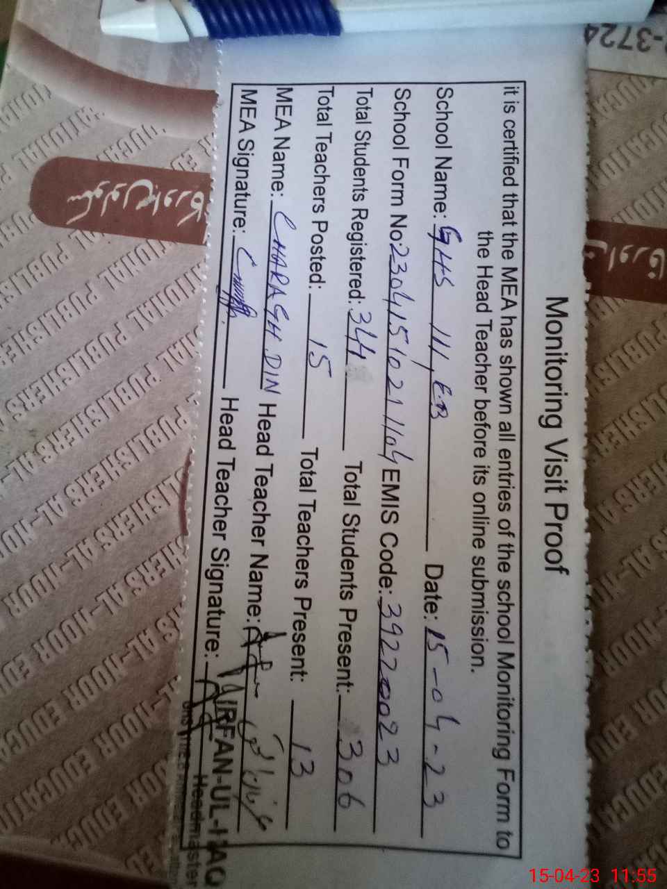 | Attendance Register | Head Teacher | MEA with School | Visit Proof |