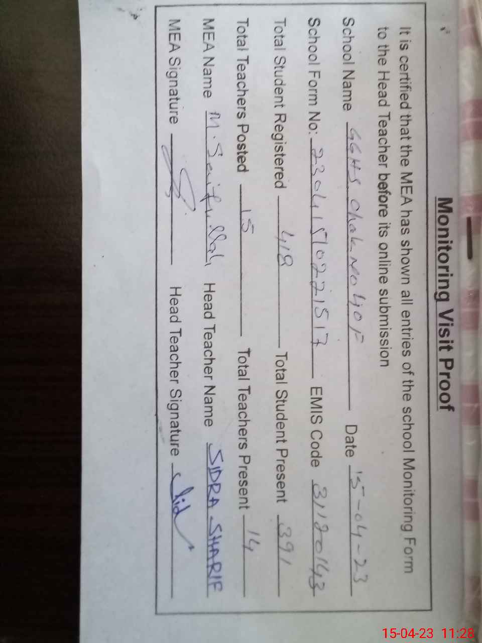 | Attendance Register | Head Teacher | MEA with School | Visit Proof |