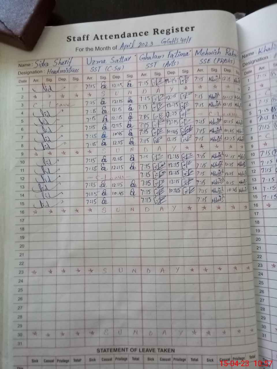 | Remarks (Use Separate Page if Required): H T Miss Sidra Sharif appointed and present but in list not shown | |||||
