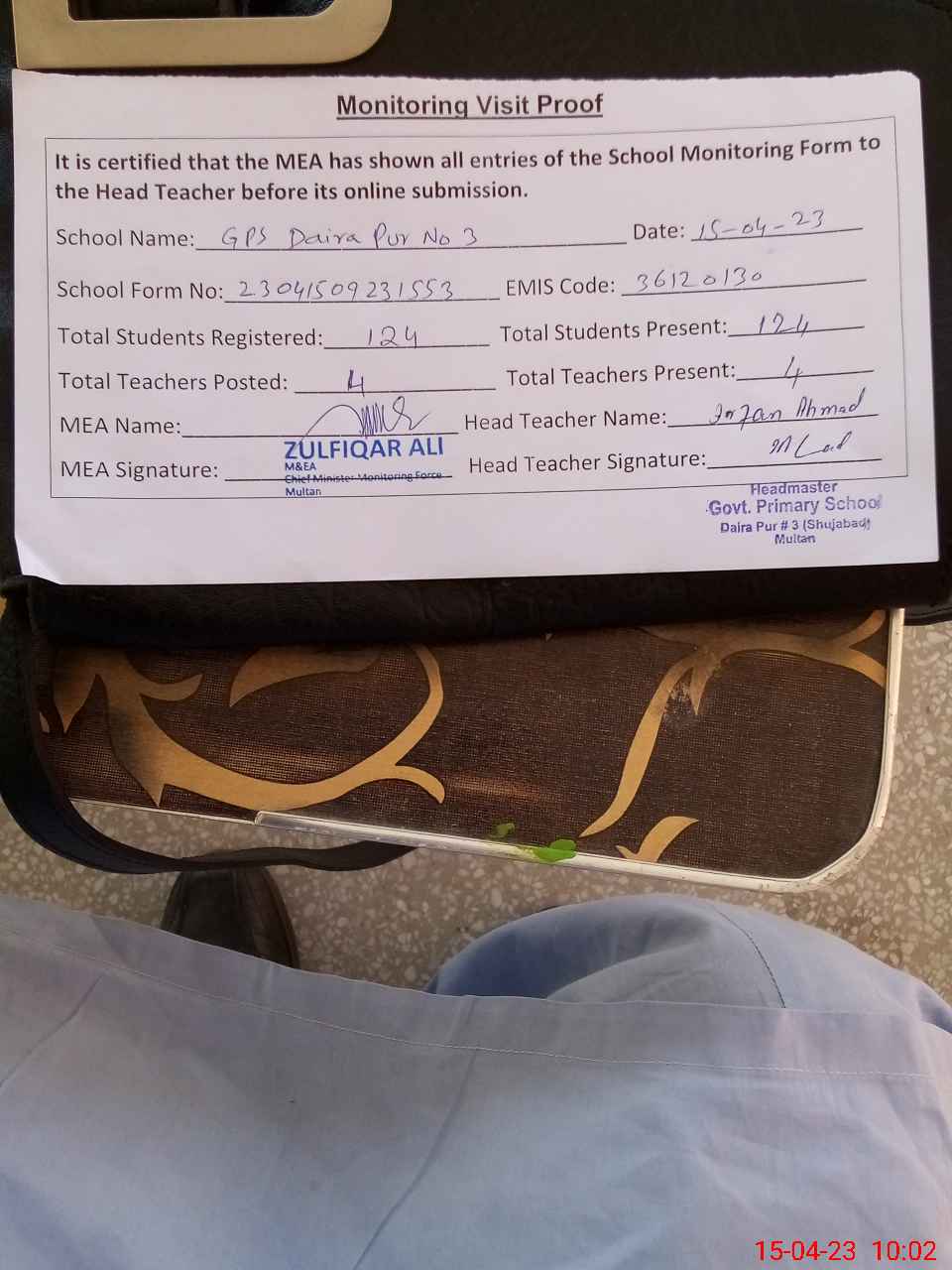 | EMIS Code: 36120130 | Name of School: GPS DAIRA PUR NO. 3 SHUJA ABAD | |||