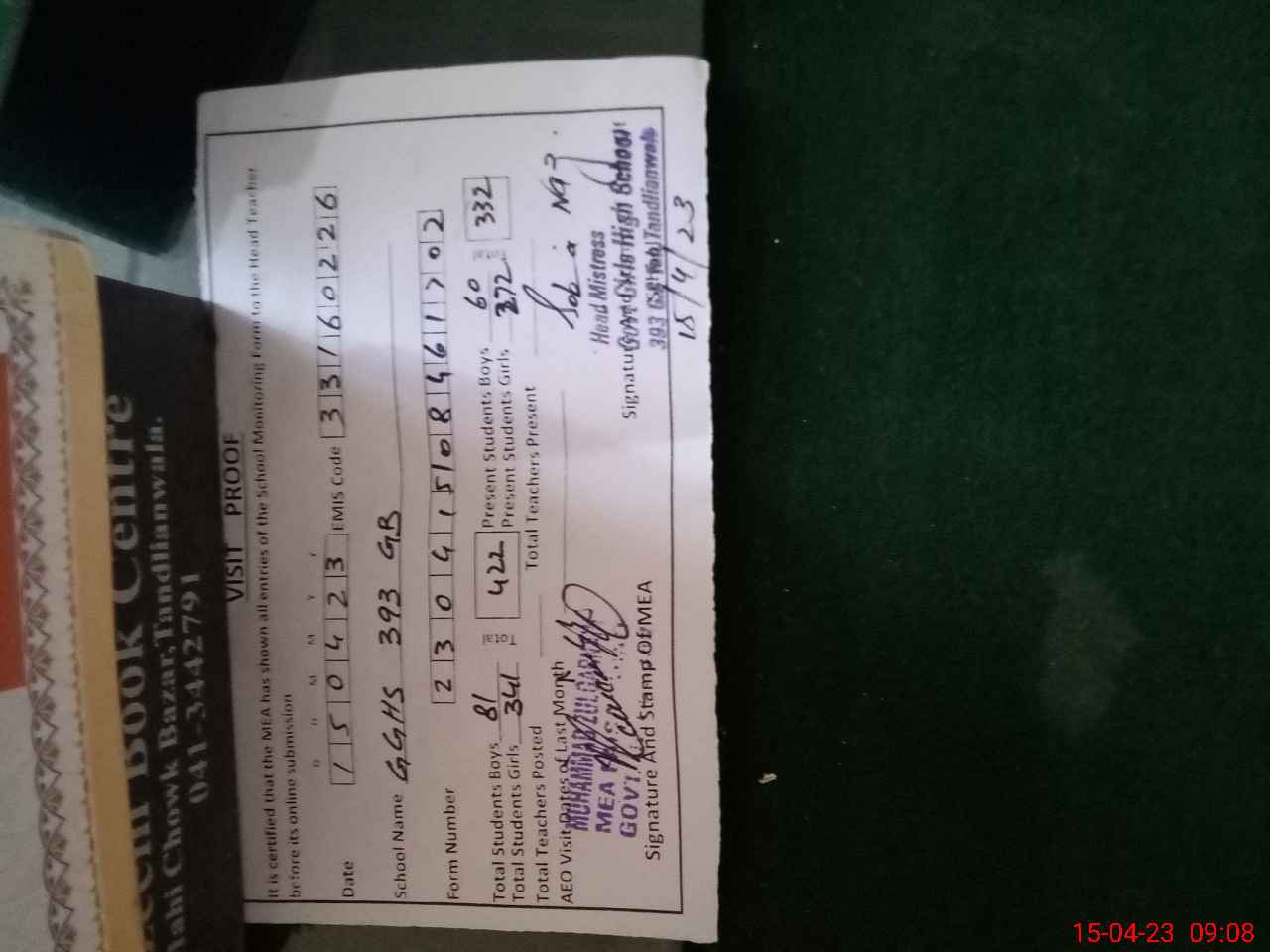 | Attendance Register | Head Teacher | MEA with School | Visit Proof |