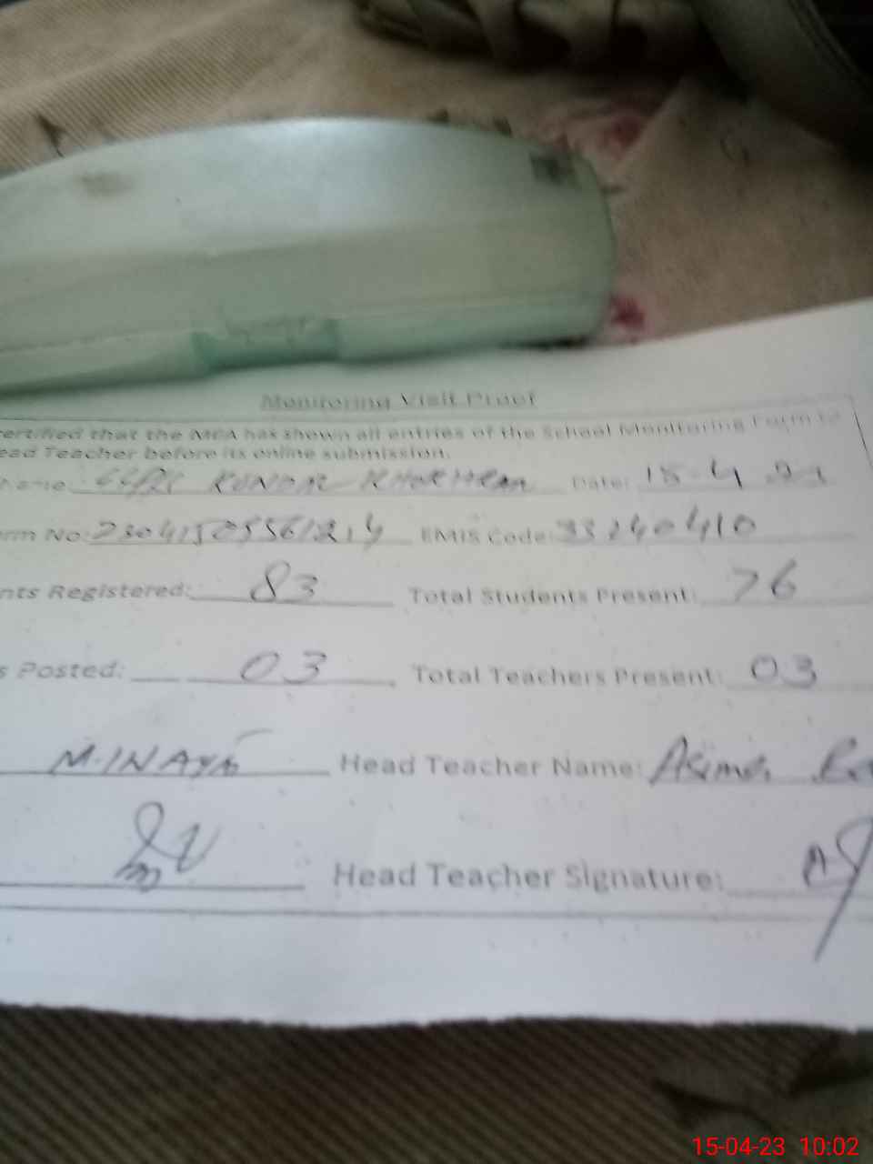 | Attendance Register | Head Teacher | MEA with School | Visit Proof |