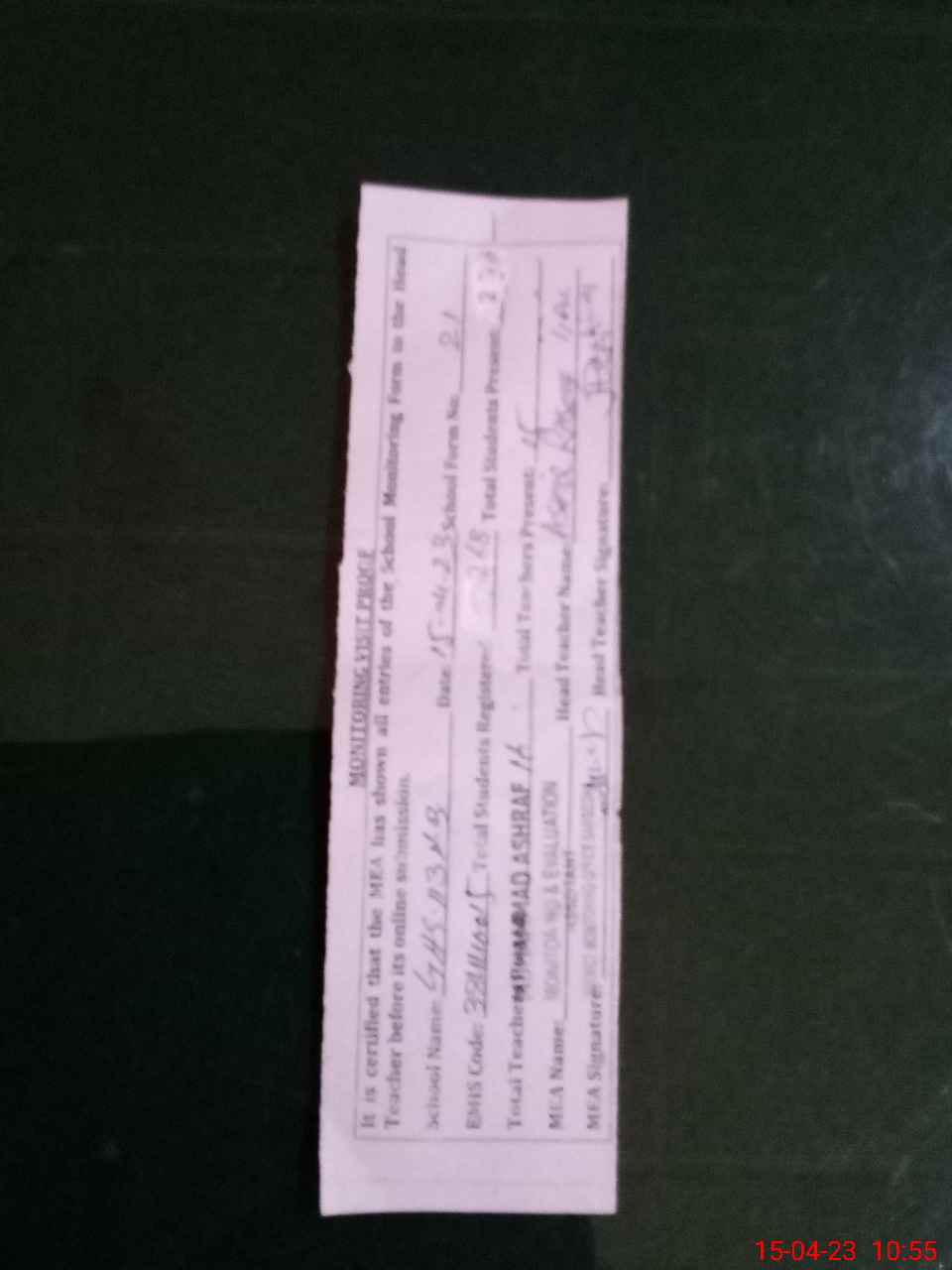 | Attendance Register | Head Teacher | MEA with School | Visit Proof |