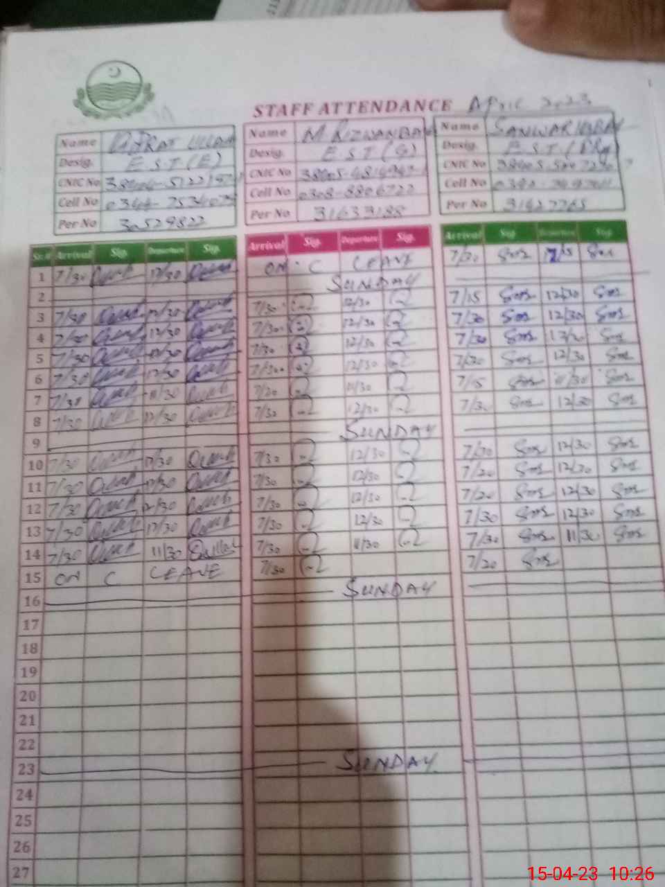 | CNIC | Full Name | Designation | R/C | Absence During Last Calender Month |
