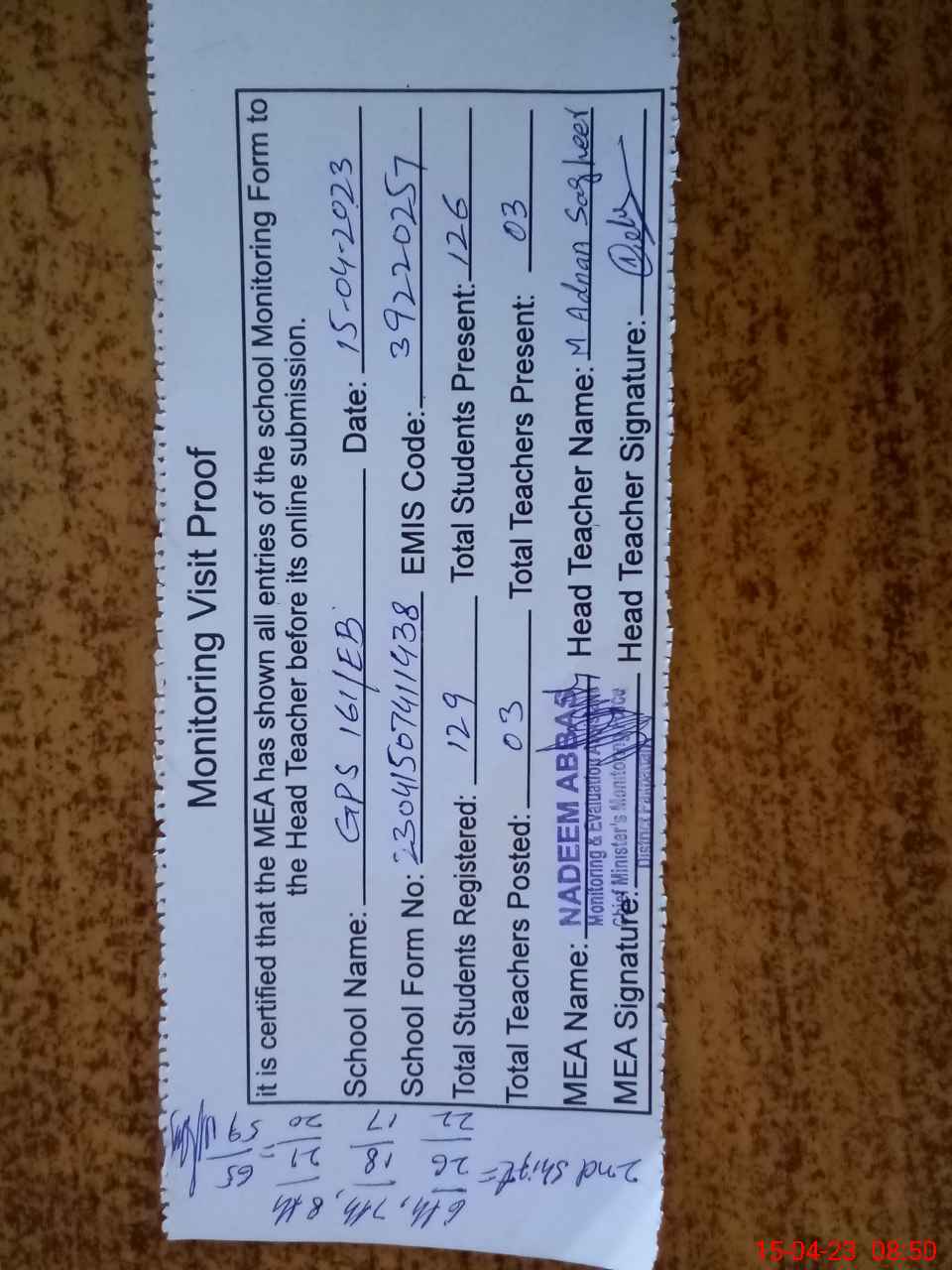 | Attendance Register | Head Teacher | MEA with School | Visit Proof |
