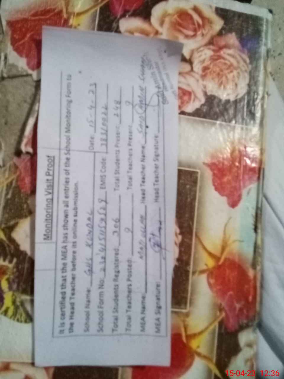 | Attendance Register | Head Teacher | MEA with School | Visit Proof |