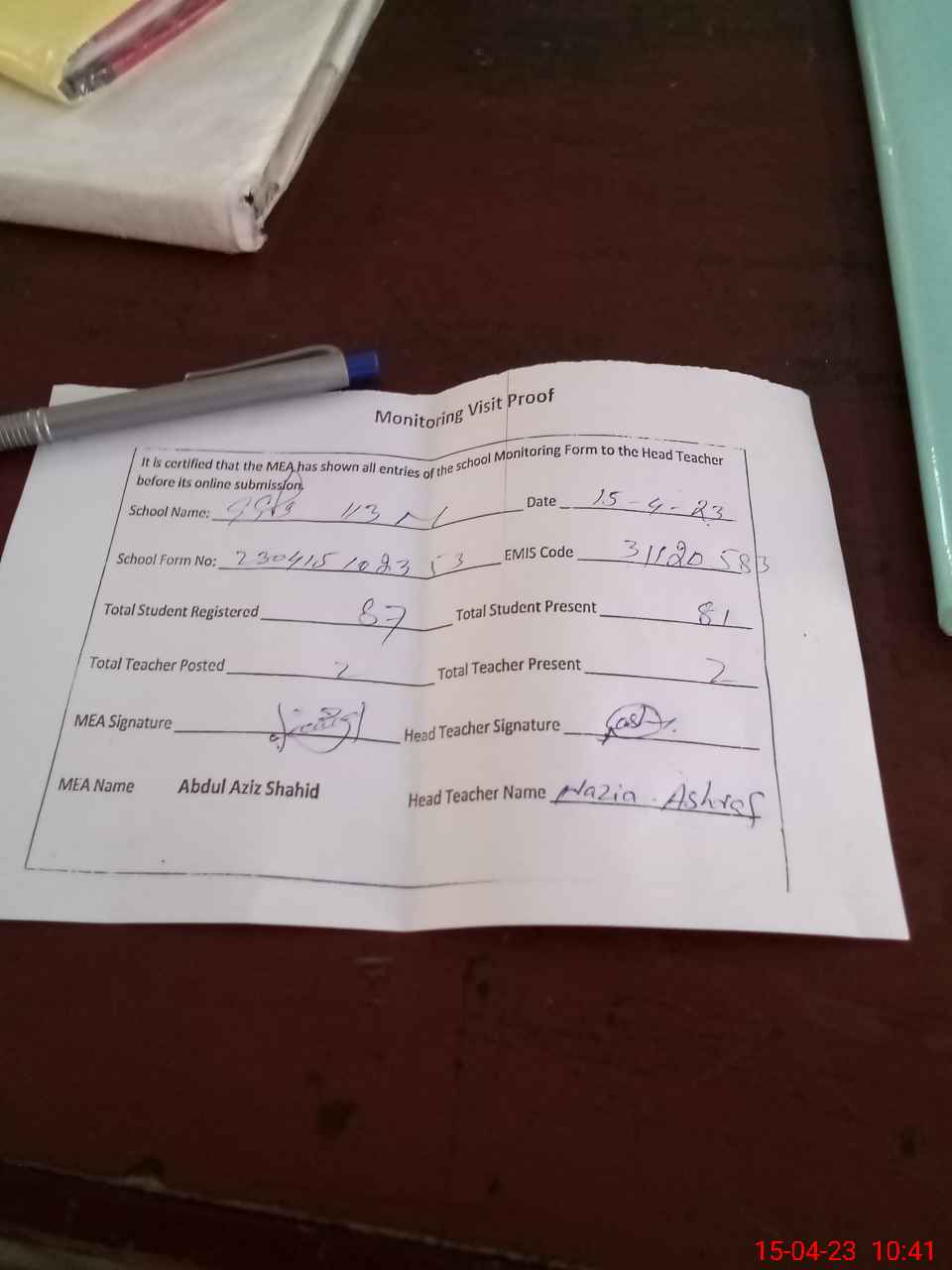 | Attendance Register | Head Teacher | MEA with School | Visit Proof |