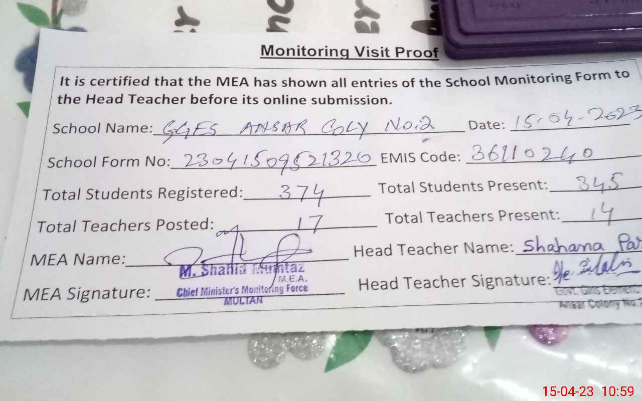 | EMIS Code: 36110240 | Name of School: GGES ANSAR COLONY NO. 2 MULTAN CITY | |||