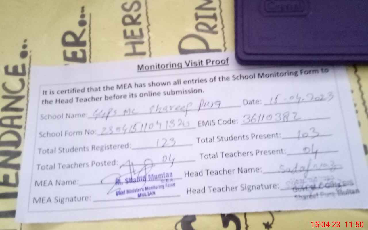 | EMIS Code: 36110382 | Name of School: GGPS MC SHAREEF PURA | |||