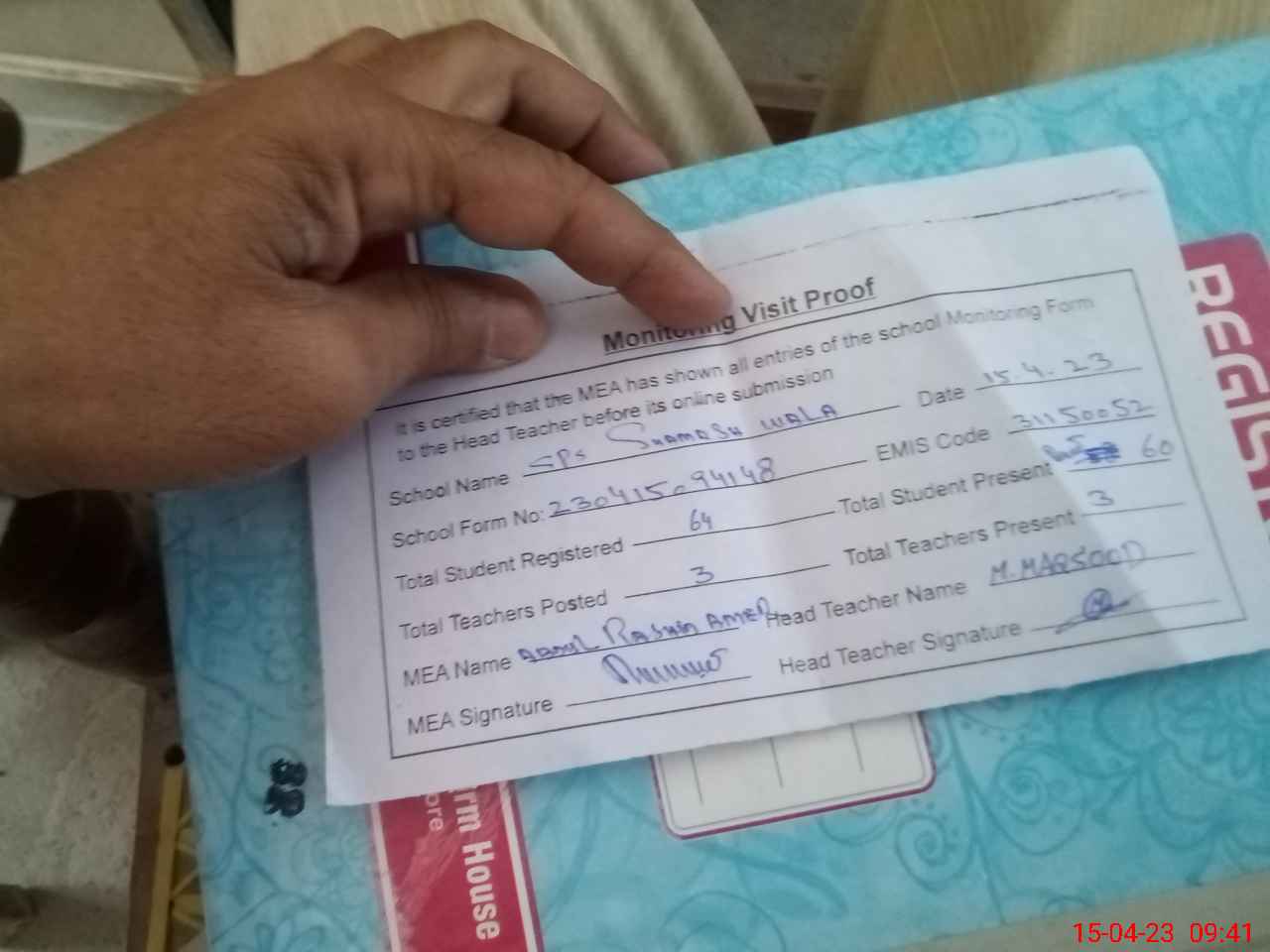 | Attendance Register | Head Teacher | MEA with School | Visit Proof |