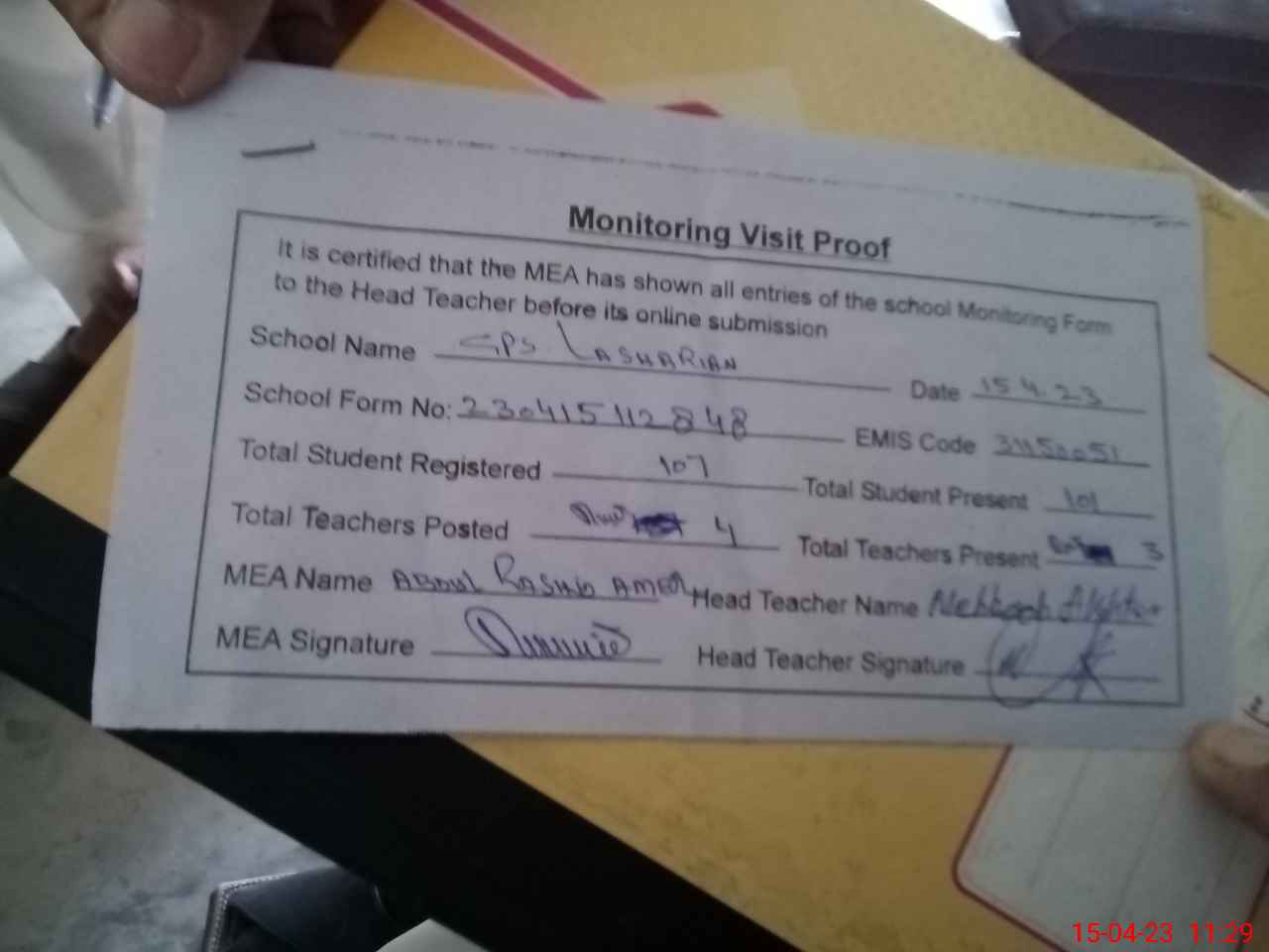 | Attendance Register | Head Teacher | MEA with School | Visit Proof |