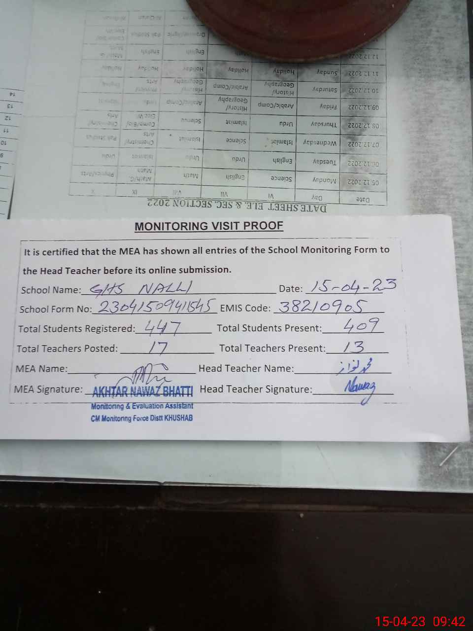 | Attendance Register | Head Teacher | MEA with School | Visit Proof |