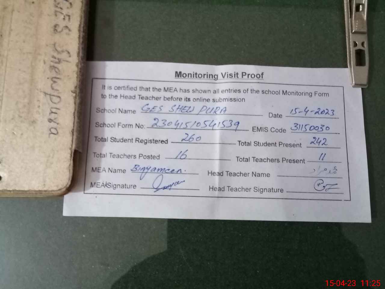 | Attendance Register | Head Teacher | MEA with School | Visit Proof |