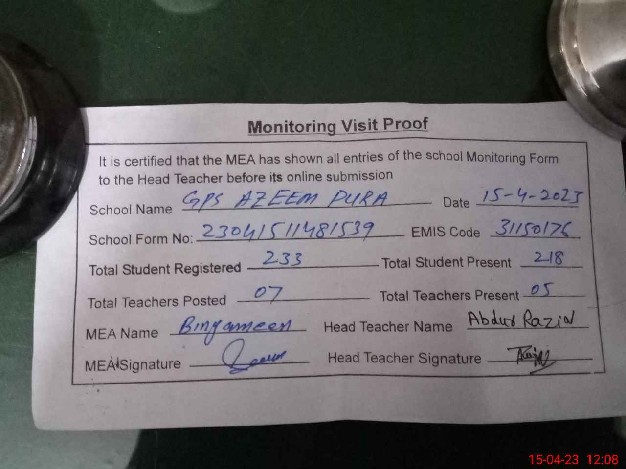| EMIS Code: 31150176 | Name of School: GPS AZEEM PURA | |||
