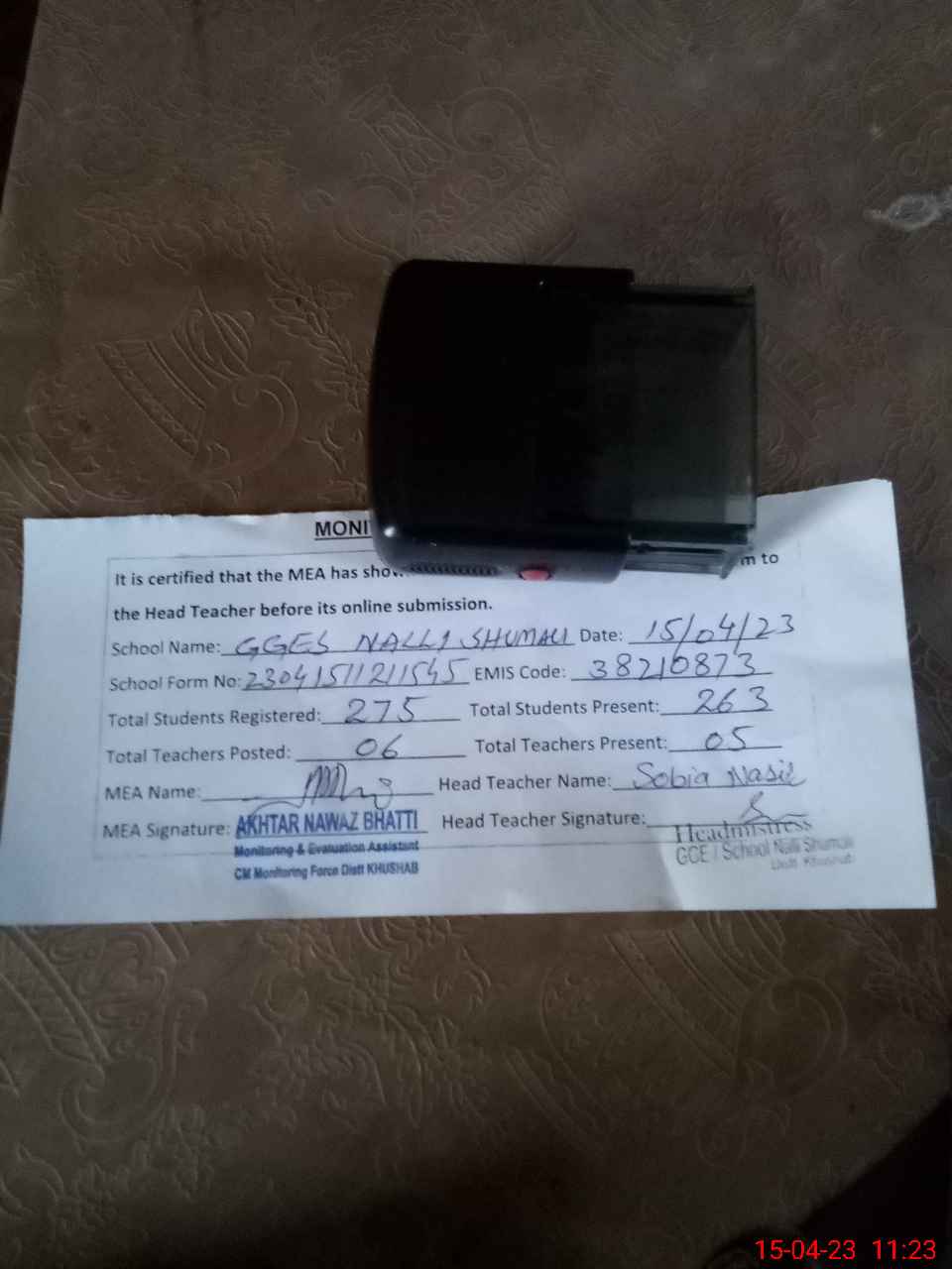 | Monitoring Date: 15-04-2023 | Start Time: 15-04-2023 10:50 AM | End Time: 15-04-2023 11:23 AM | Name of MEA: AK**** NA**** (R**** | |