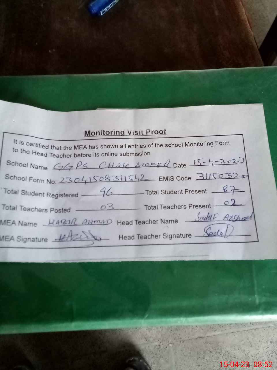 | EMIS Code: 31150320 | Name of School: GGPS CHAK AMEER | |||