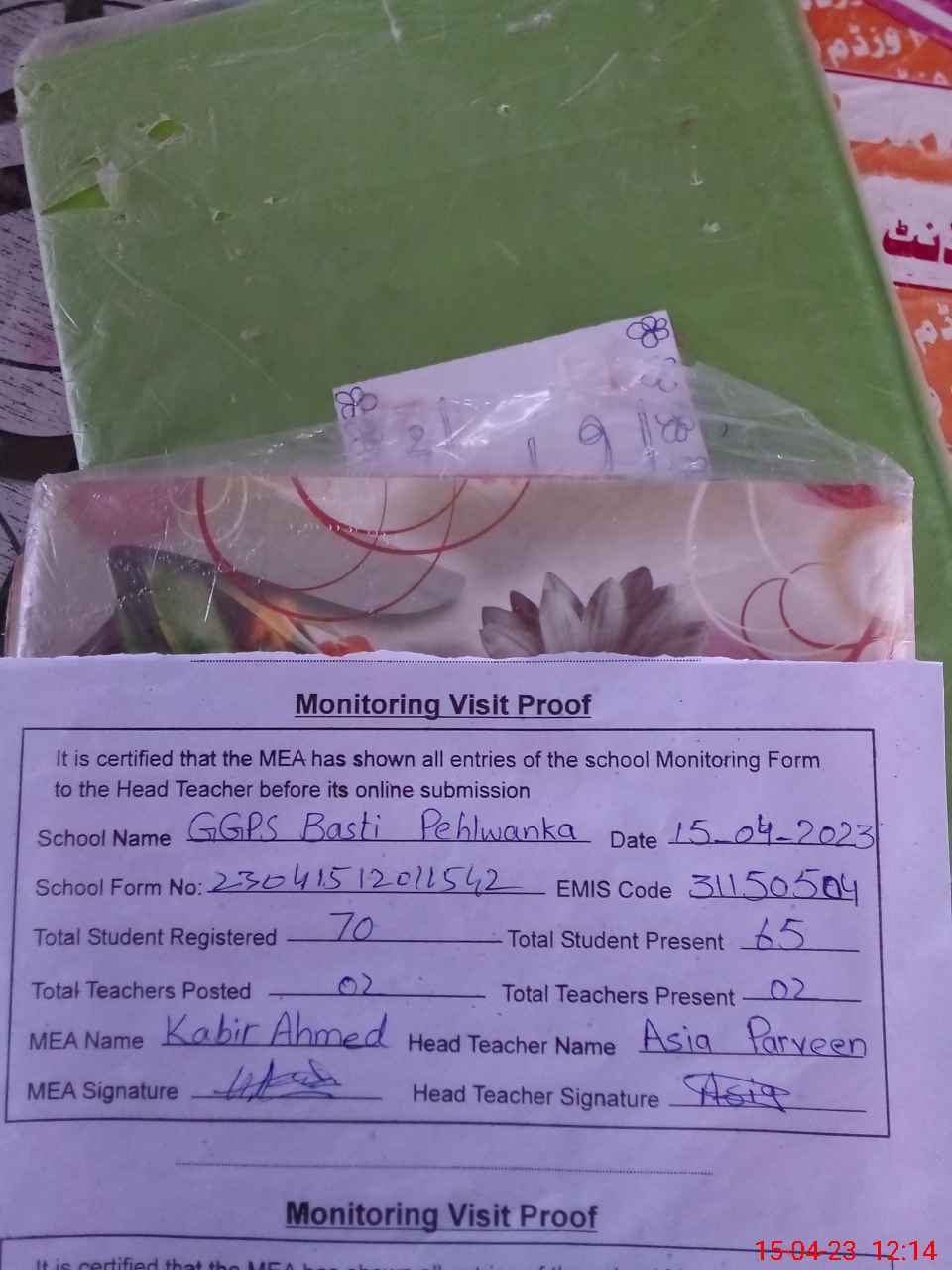 | Attendance Register | Head Teacher | MEA with School | Visit Proof |