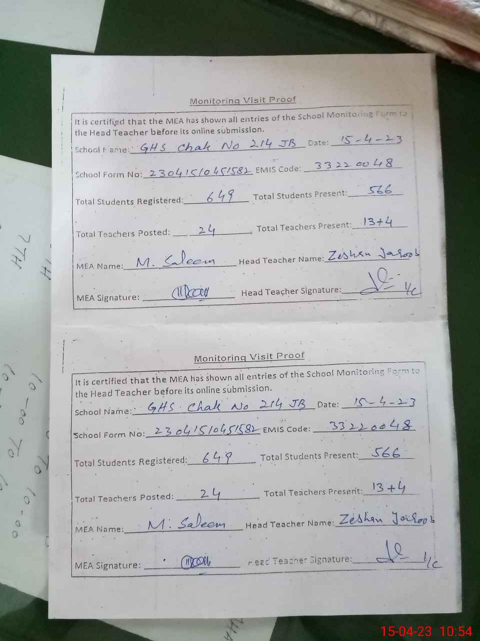 | Attendance Register | Head Teacher | MEA with School | Visit Proof |