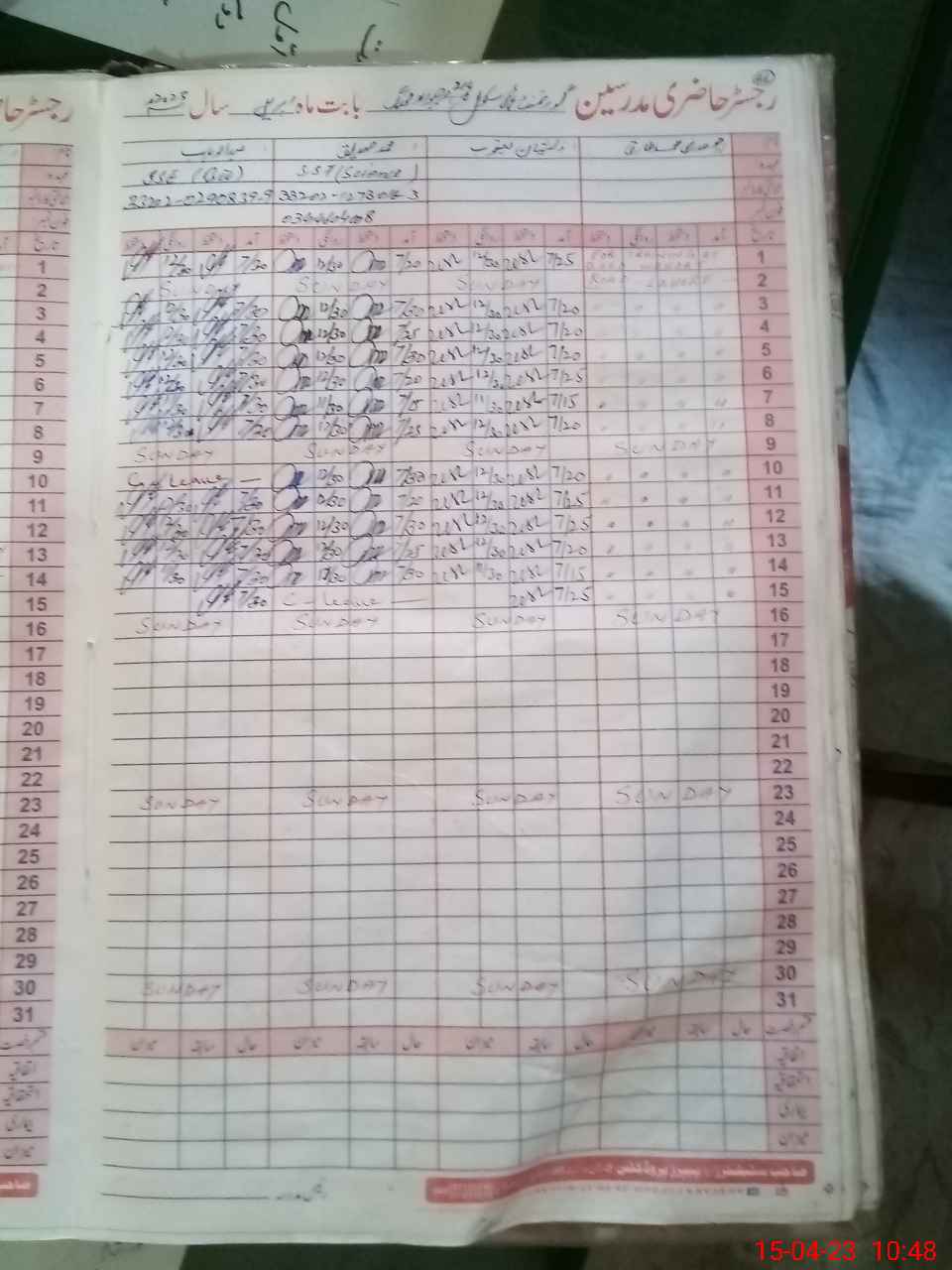 | CNIC | Full Name | Designation | R/C | Absence During Last Calender Month |