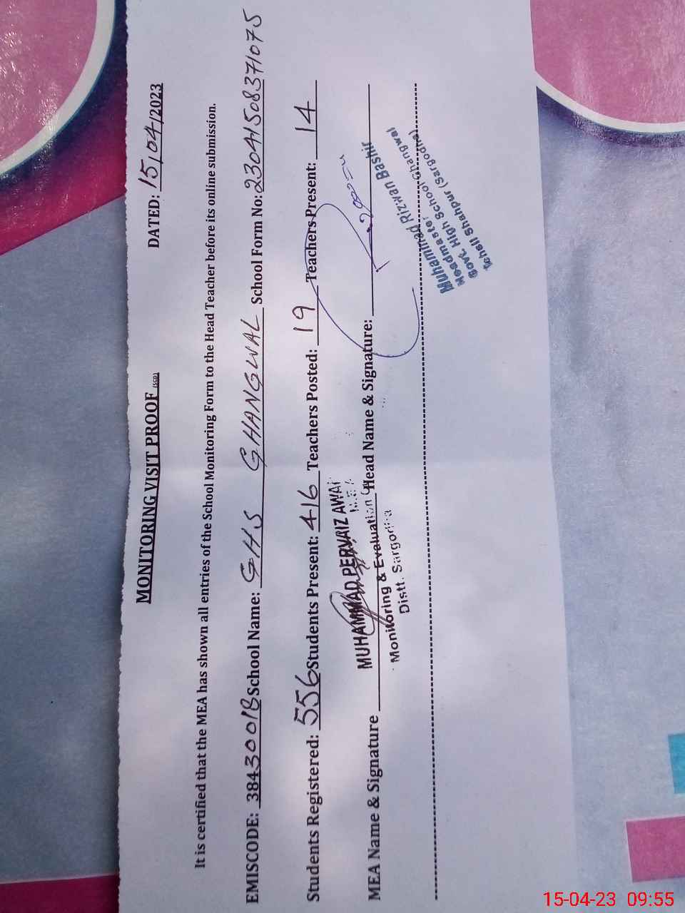 | Certified that this School was Inspected by the Undersigned MEA/DMO Today and the Information Stated Above is as Per Record. | |||||