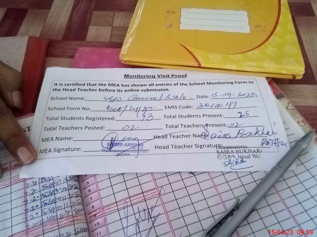 | Attendance Register | Head Teacher | MEA with School | Visit Proof |