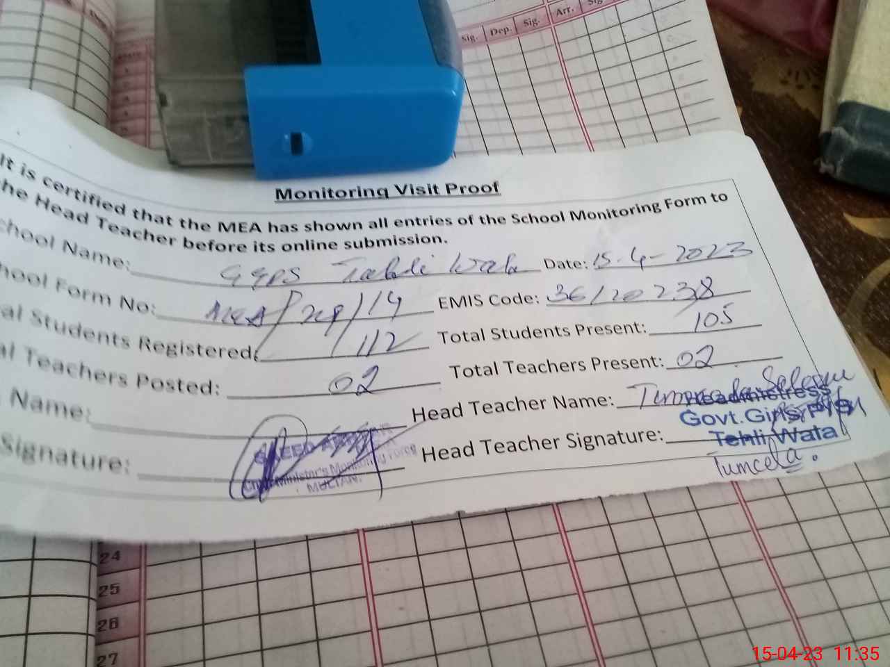 | Attendance Register | Head Teacher | MEA with School | Visit Proof |