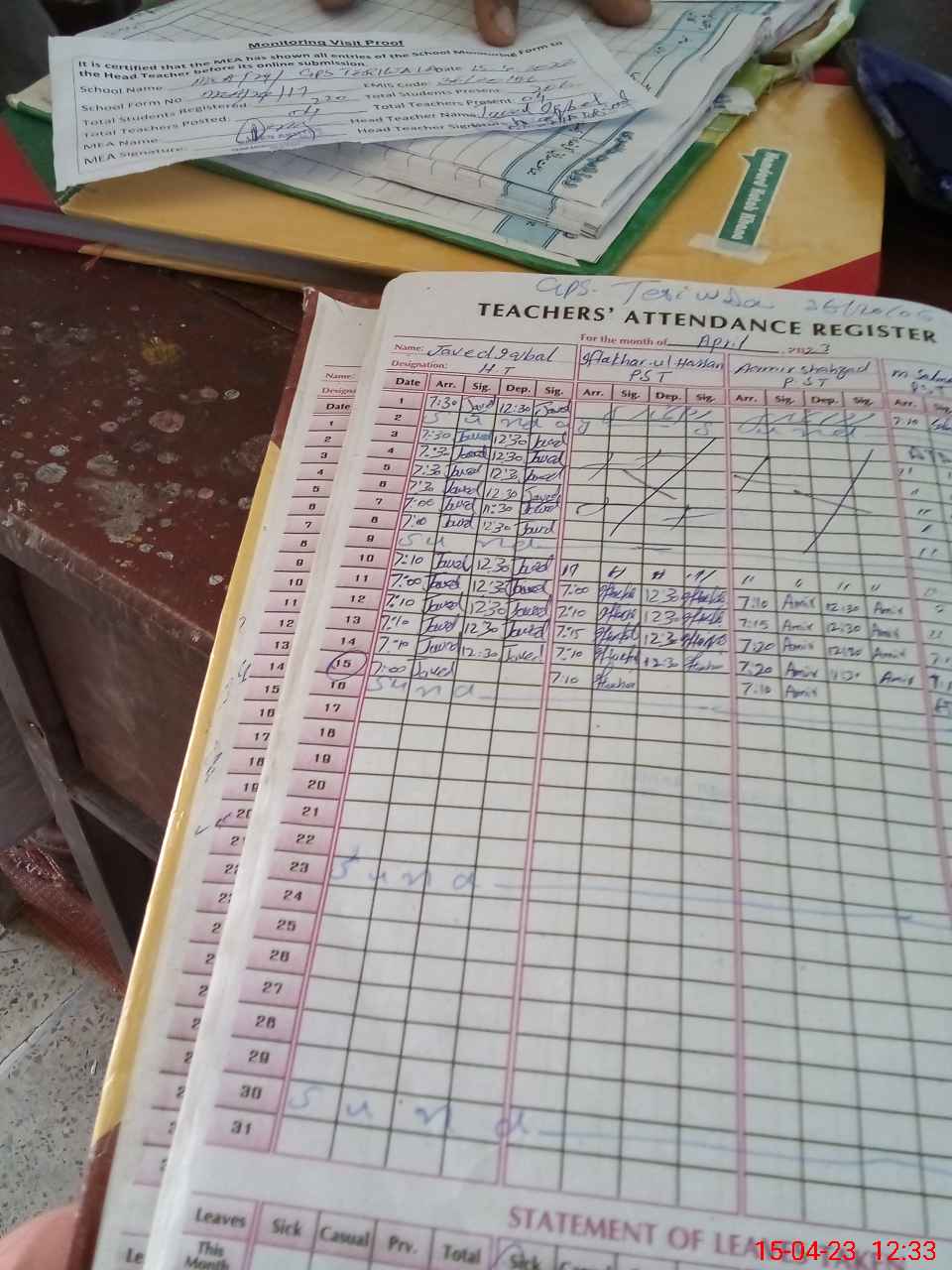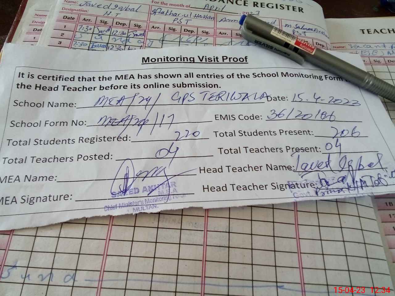 | Attendance Register | Head Teacher | MEA with School | Visit Proof |