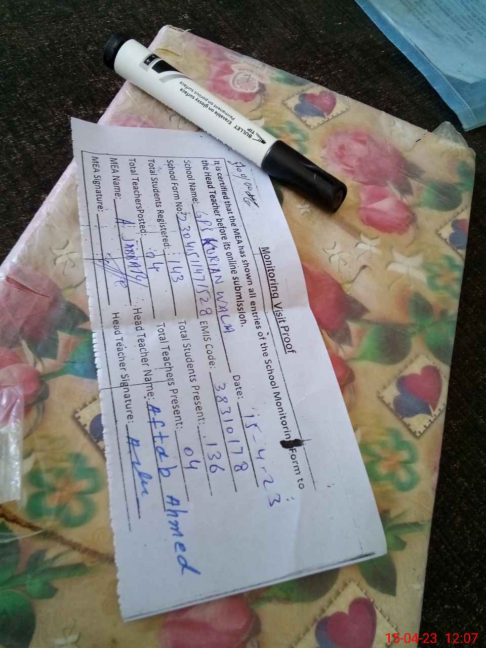 | Attendance Register | Head Teacher | MEA with School | Visit Proof |