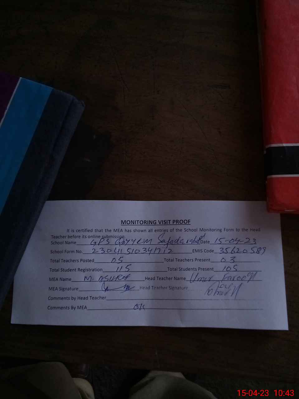 | Attendance Register | Head Teacher | MEA with School | Visit Proof |