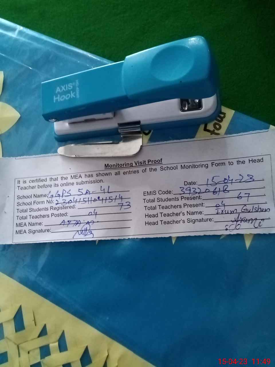 | Attendance Register | Head Teacher | MEA with School | Visit Proof |