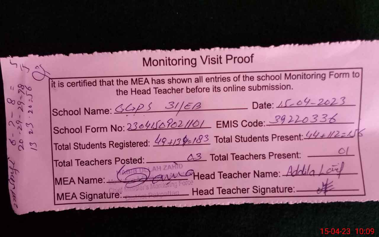 | Attendance Register | Head Teacher | MEA with School | Visit Proof |