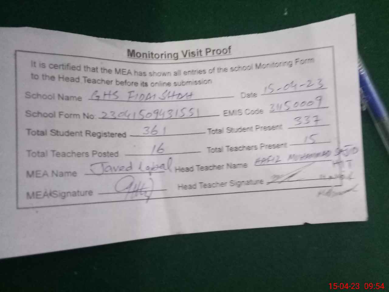| Attendance Register | Head Teacher | MEA with School | Visit Proof |