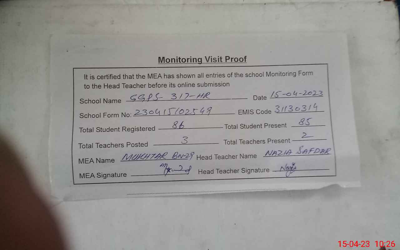 | Attendance Register | Head Teacher | MEA with School | Visit Proof |